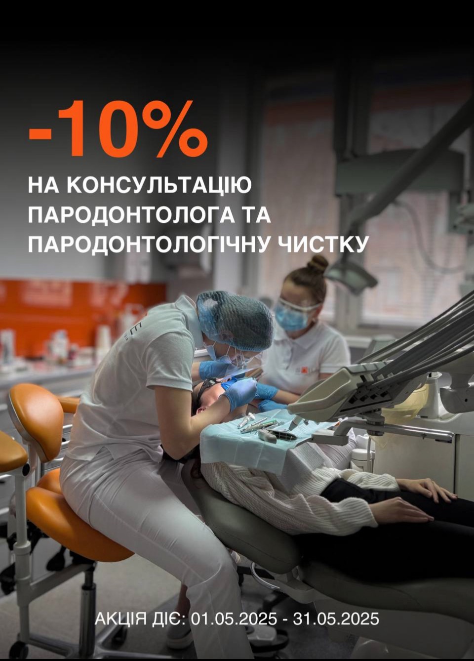 Шановні пацієнти, ради повідомити, що з 01.05.25р. по 31.05.25р. діє знижка на консультацію пародонтолога та пародонтологічну чистку - 10%.