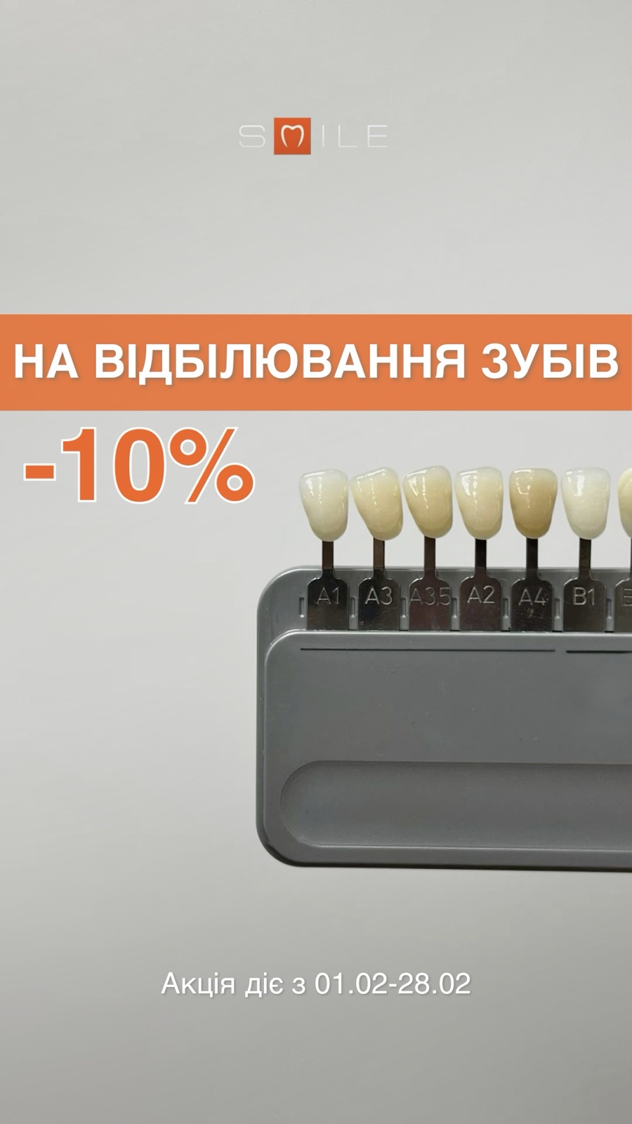 З 01.02.26 до 28.02.26 знижка на відбілювання зубів – 10%.